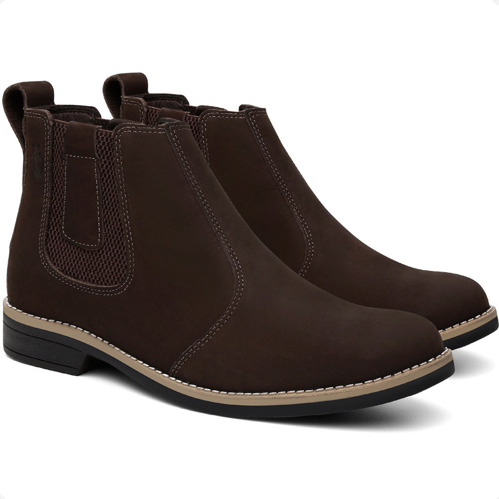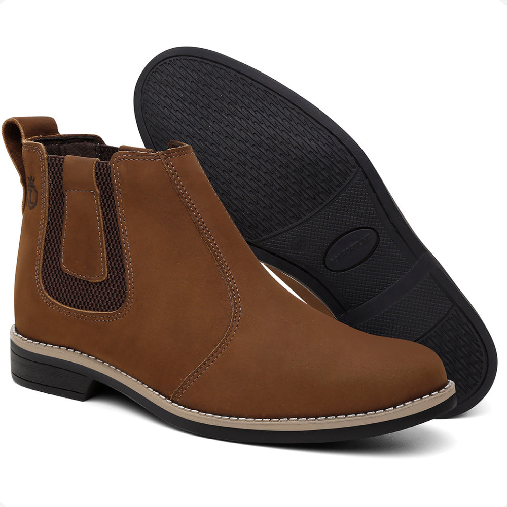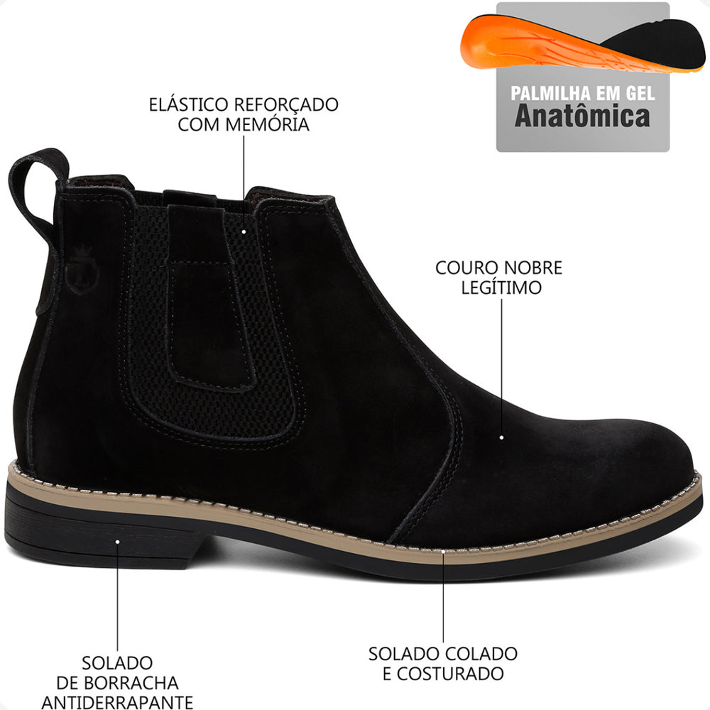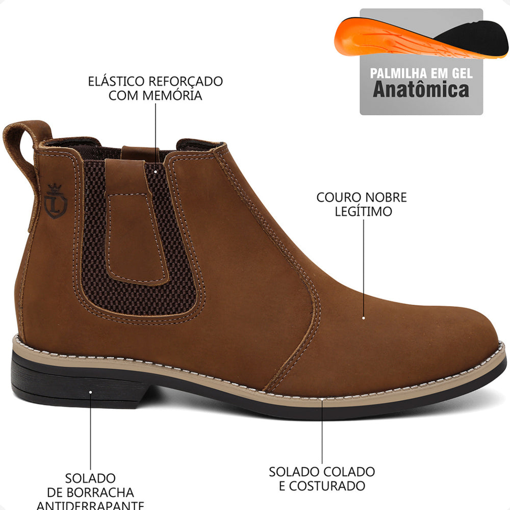 Esta bota botina masculina Chelsea é produzida em couro legítimo natural e oferece conforto avançado com palmilhas em gel com memória, que proporcionam suporte e ajudam na proteção dos pés, coluna e pernas. O solado é resistente, colado e costurado, garantindo durabilidade e segurança em cada passo.