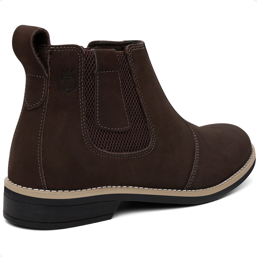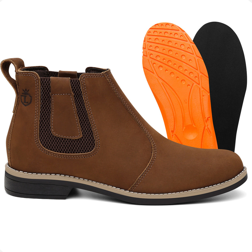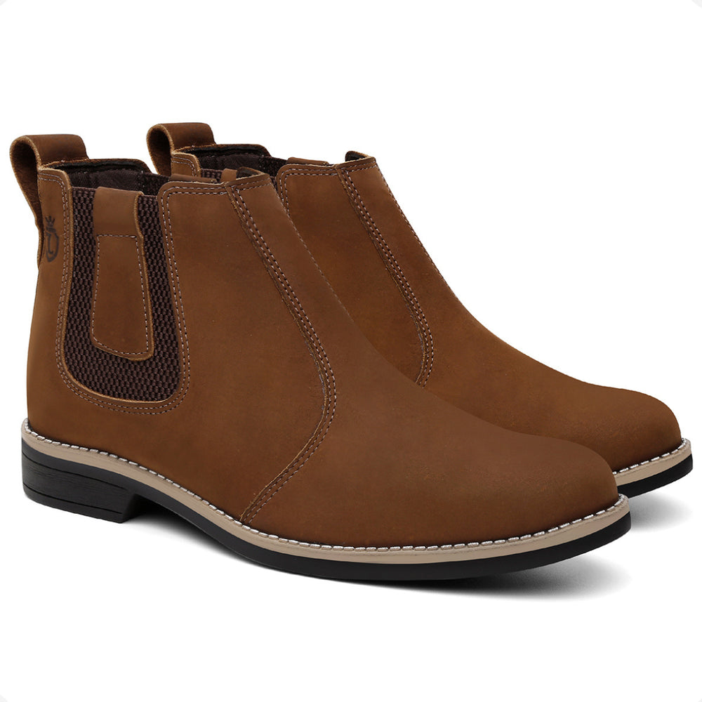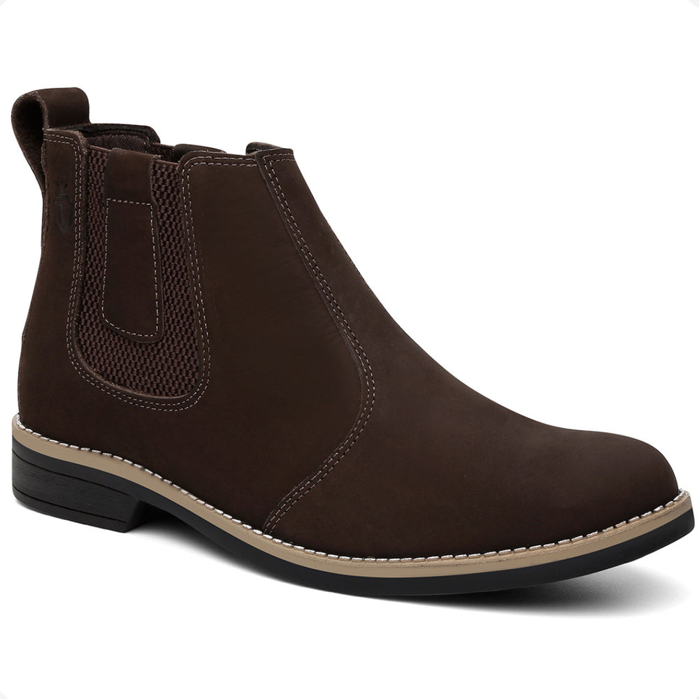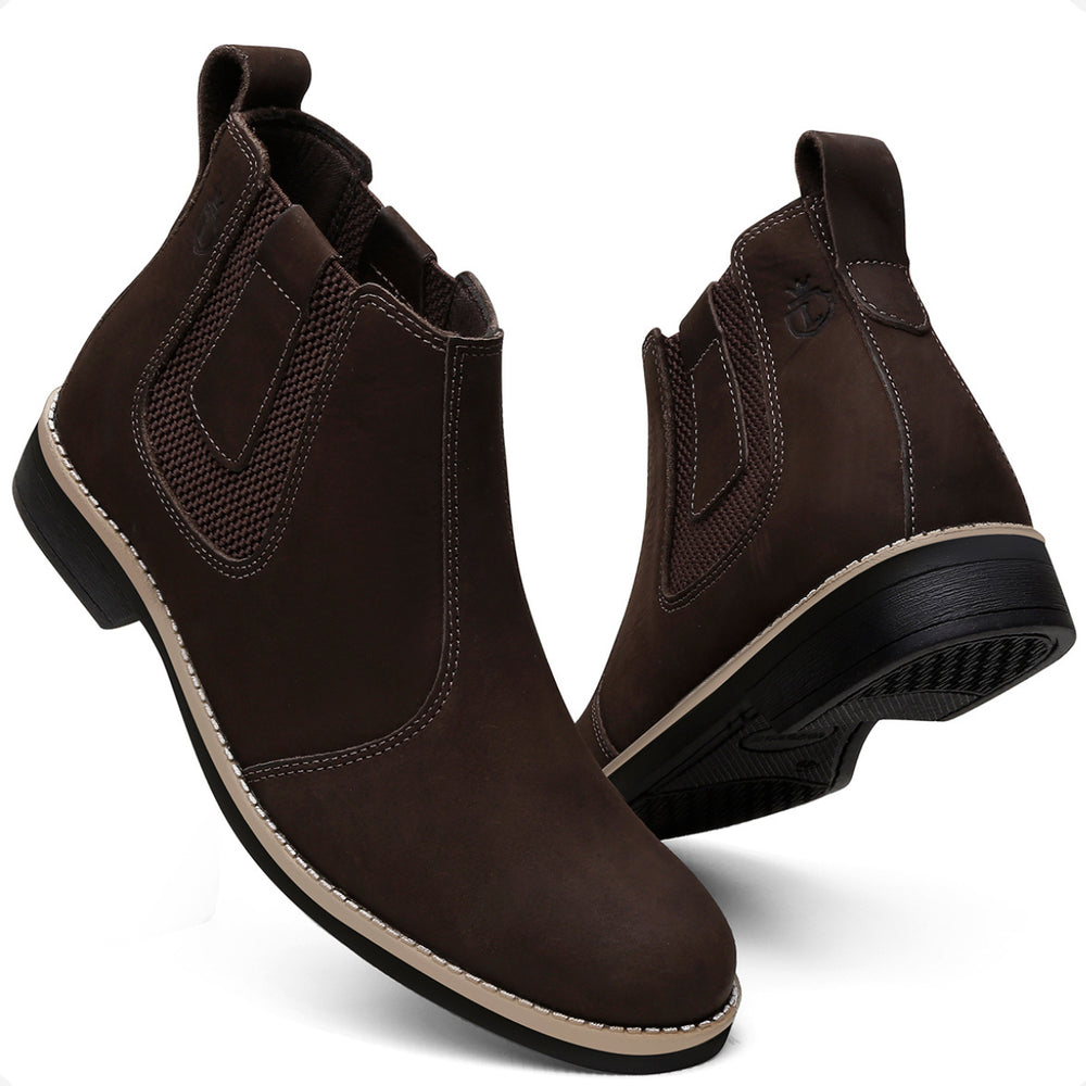 Esta bota botina masculina Chelsea é produzida em couro legítimo natural e oferece conforto avançado com palmilhas em gel com memória, que proporcionam suporte e ajudam na proteção dos pés, coluna e pernas. O solado é resistente, colado e costurado, garantindo durabilidade e segurança em cada passo.