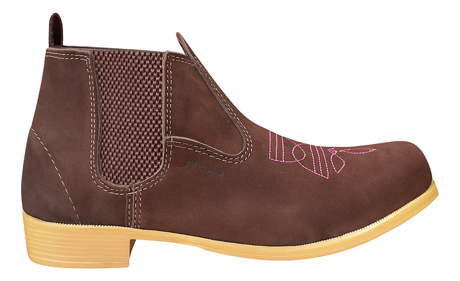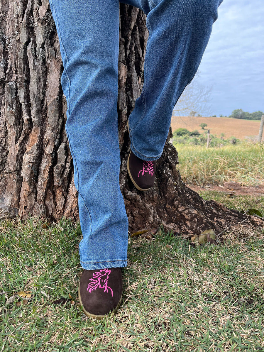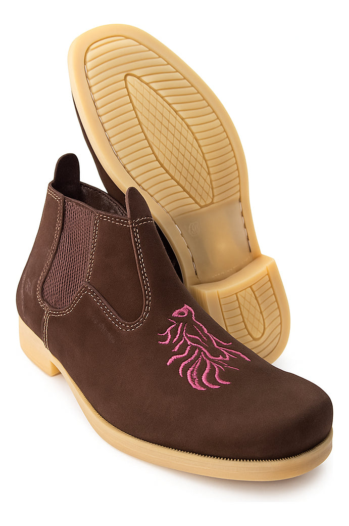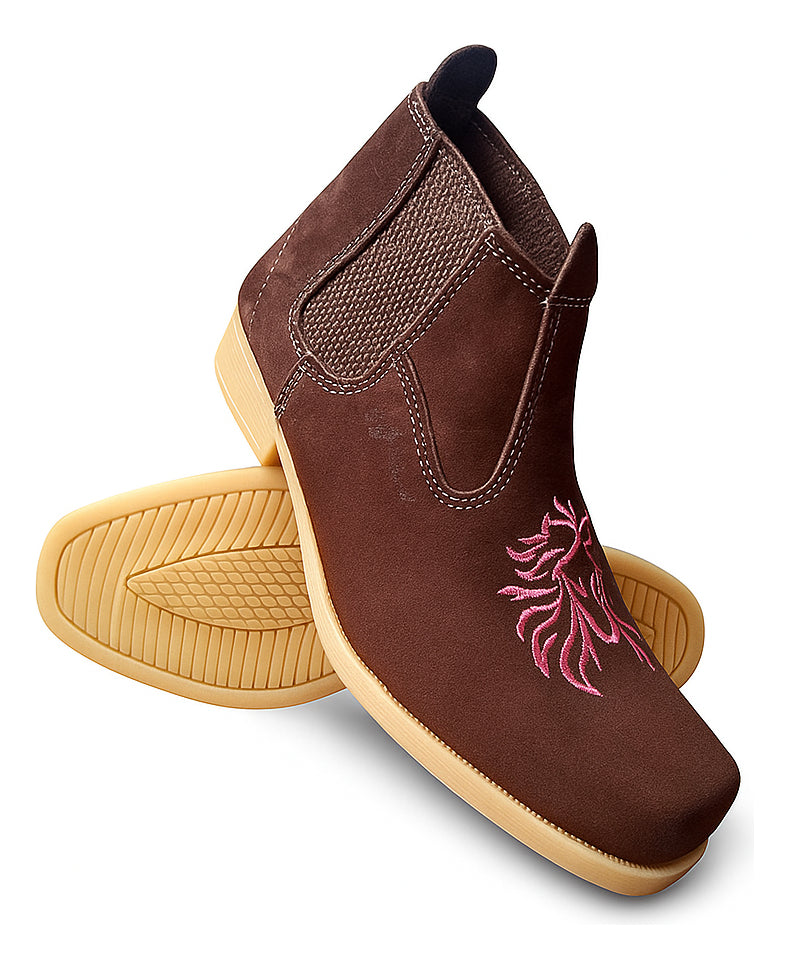 Bota feminina de estilo country com cano curto, confeccionada em couro legítimo camurça. Apresenta solado em PVC leve e resistente, oferecendo conforto e durabilidade para uso em ambientes urbanos e rurais.