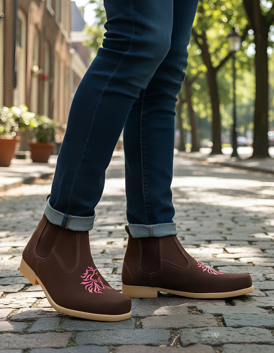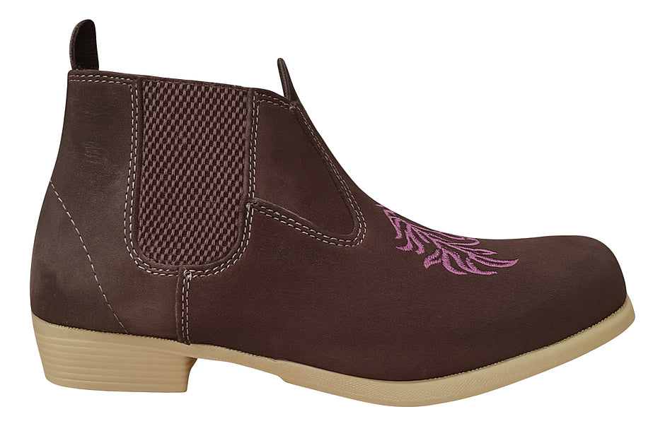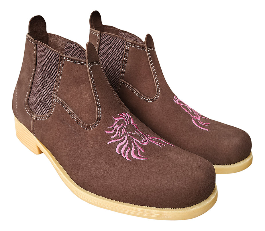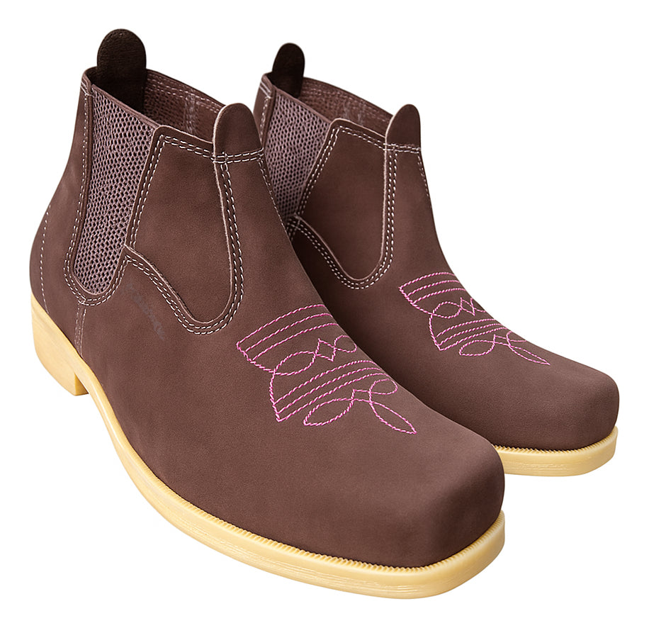 Bota feminina de estilo country com cano curto, confeccionada em couro legítimo camurça. Apresenta solado em PVC leve e resistente, oferecendo conforto e durabilidade para uso em ambientes urbanos e rurais.