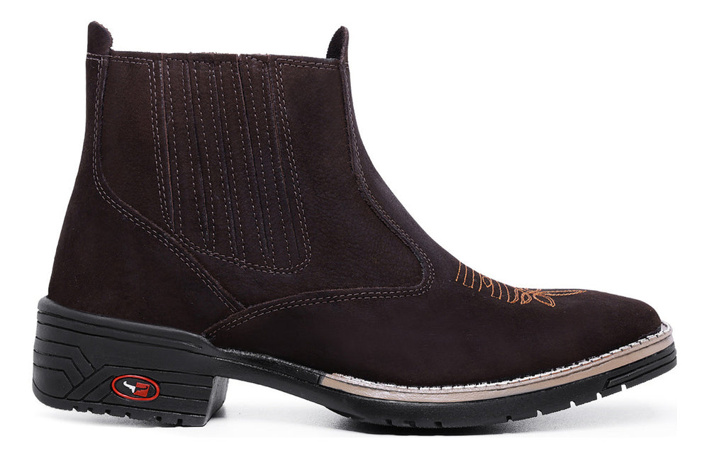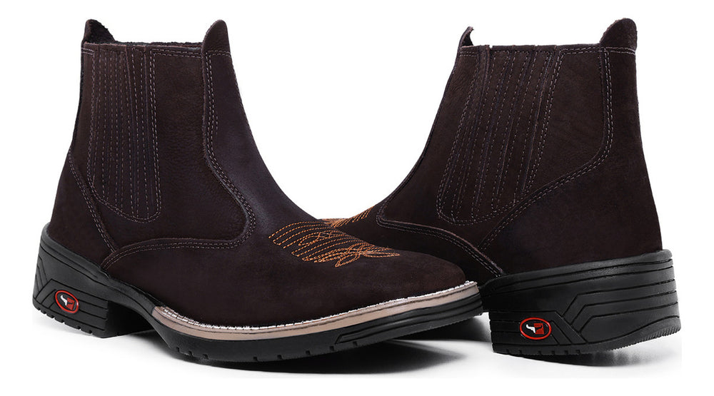 Esta bota botina texana masculina é confeccionada em couro de alta qualidade, oferecendo estilo rústico e durabilidade. Com forro espumado para maior conforto e solado costurado, é ideal para uso prolongado e atividades ao ar livre, combinando resistência e visual marcante.