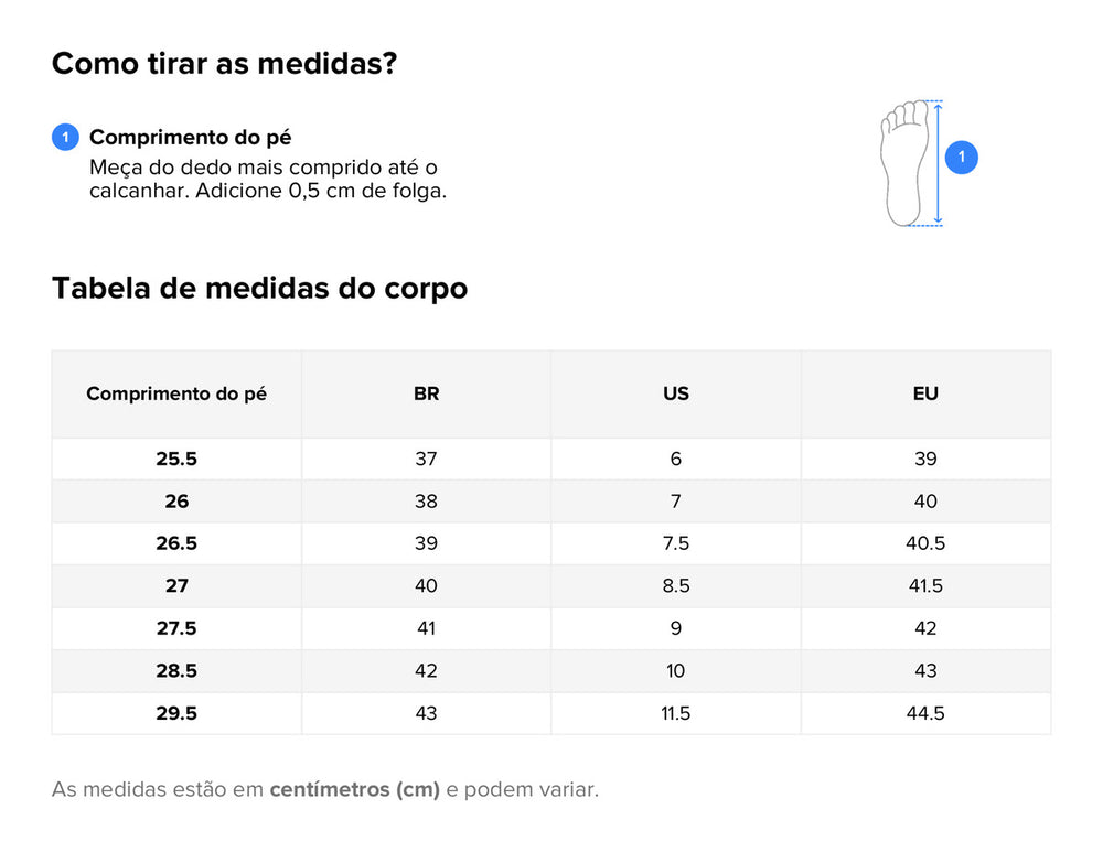 Consulte a tabela de medidas para escolher o tamanho ideal com base no seu pé.