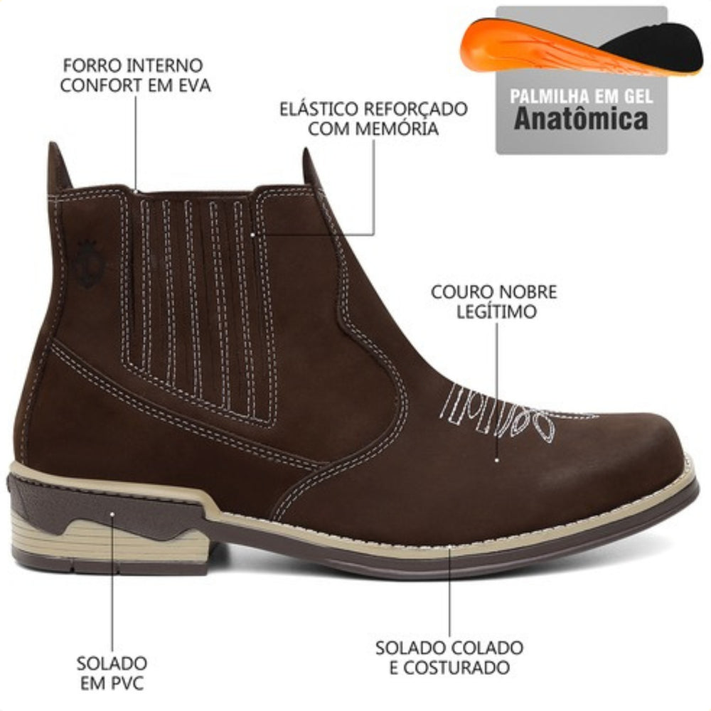 Esta bota Chelsea masculina em couro legítimo combina um design moderno com conforto e durabilidade. Ideal para quem busca estilo e sofisticação, conta com palmilha em gel para maior maciez e solado resistente costurado e colado.