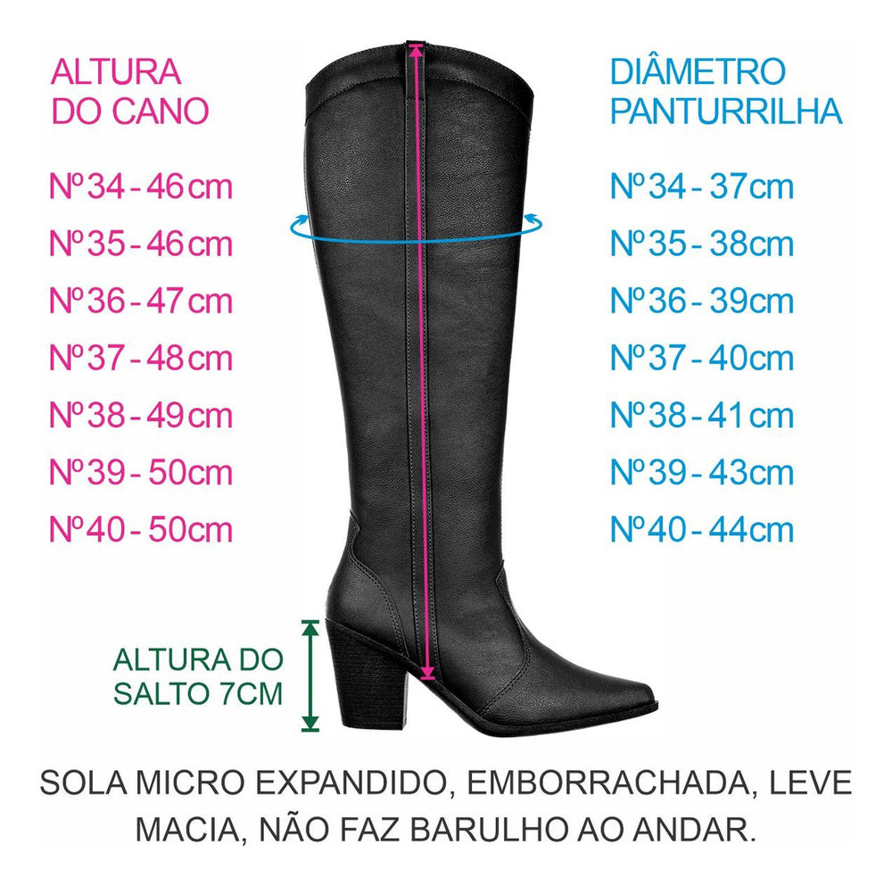 O número da bota corresponde ao padrão usual. A altura do salto é de 7 cm e a medida do cano varia conforme o diâmetro da panturrilha, confira detalhes nas imagens do produto.