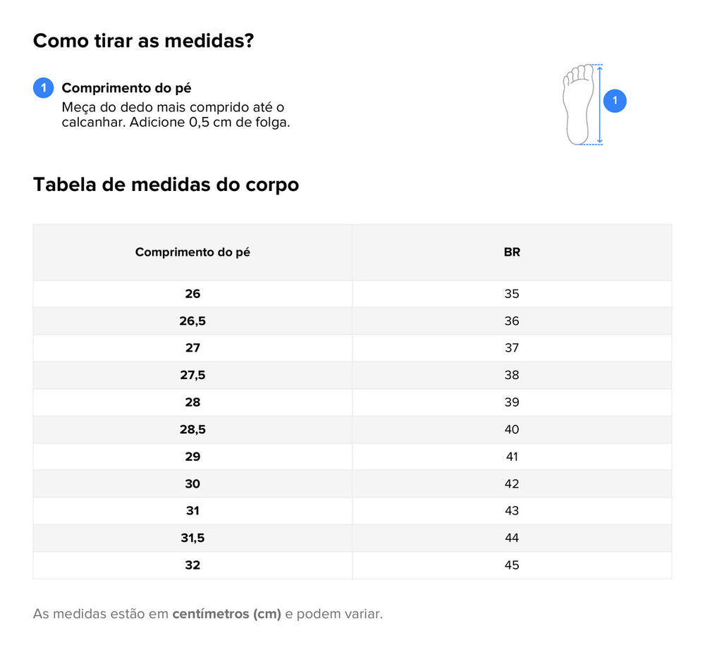 | Coluna | Comprimento da Palmilha | Altura do Cano | Circunferência da Panturrilha |