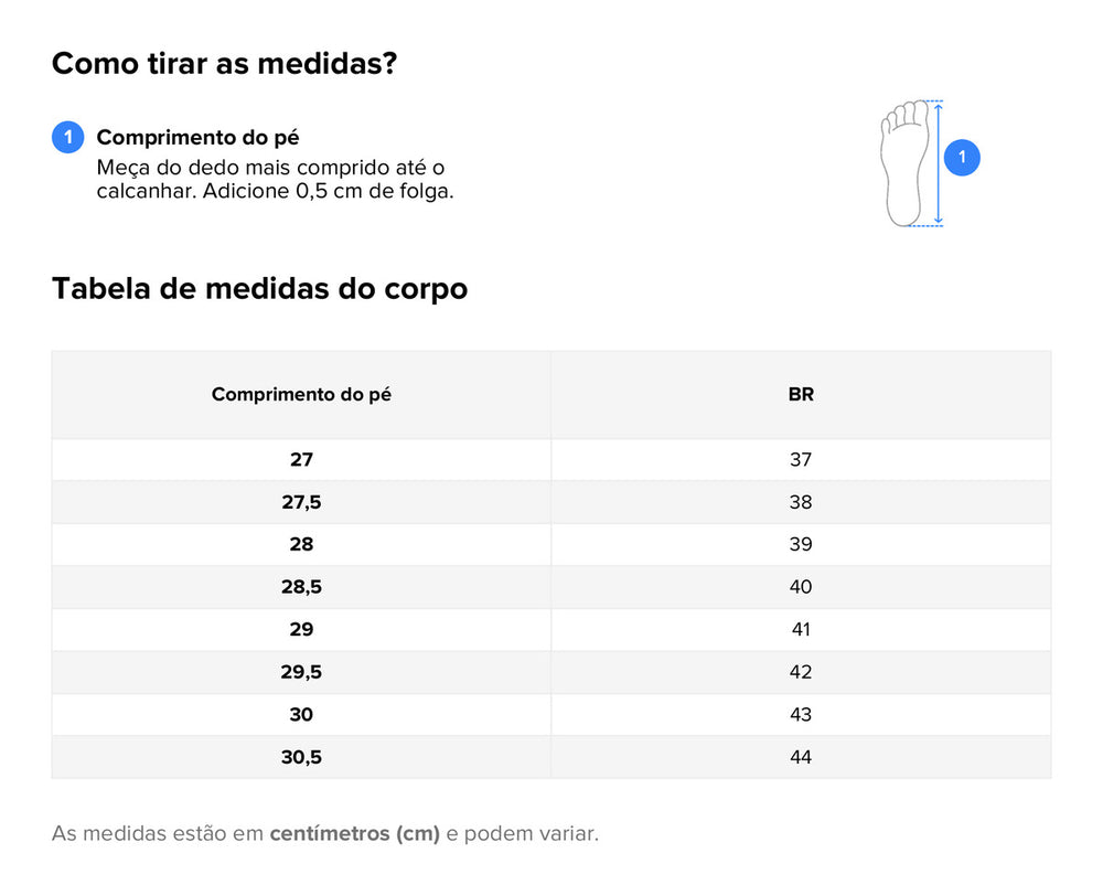 | Tamanho (BR) | Palmilha (cm) | Sola (cm) | Altura do Cano (cm) | Diâmetro do Cano (cm) |