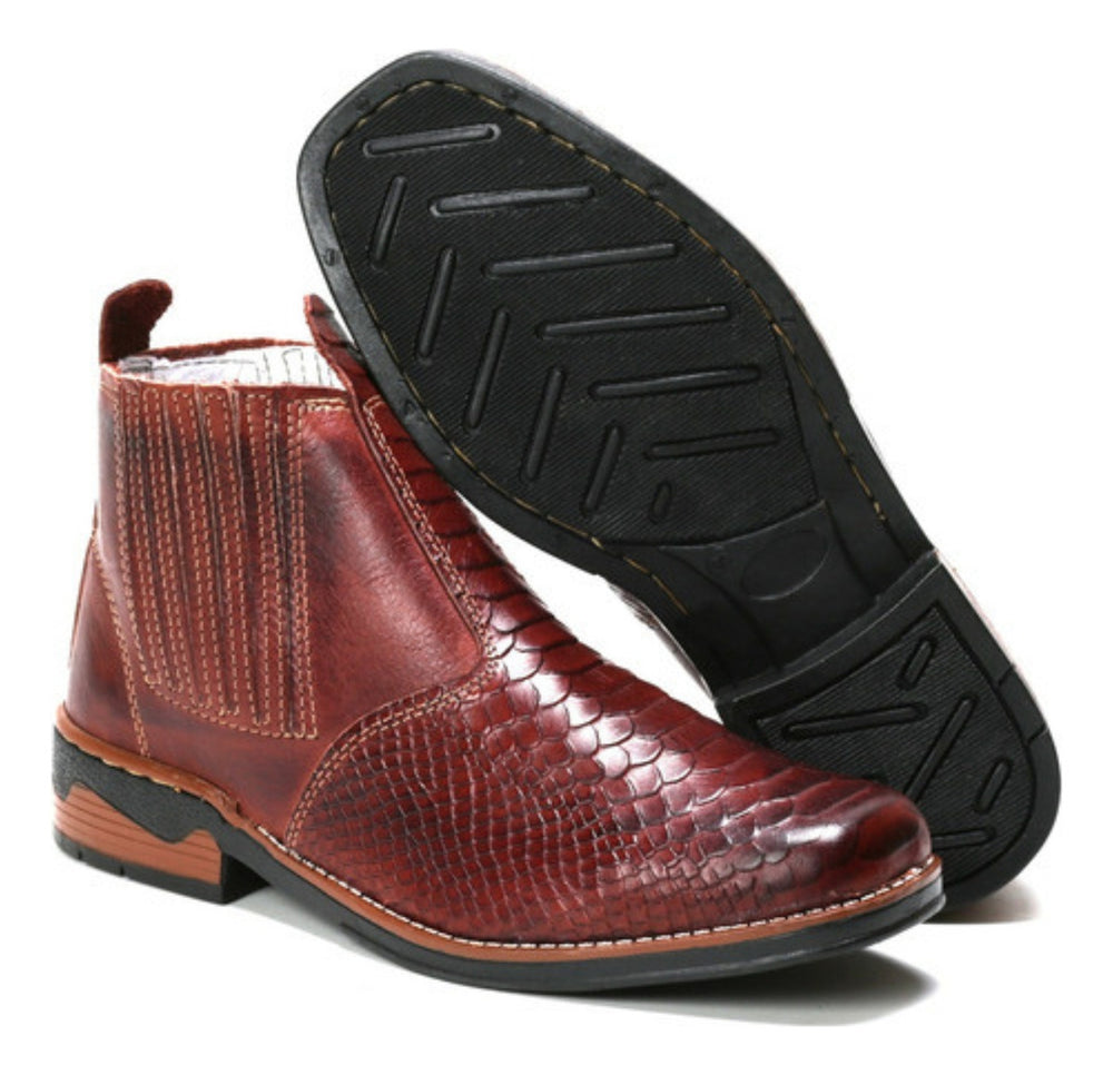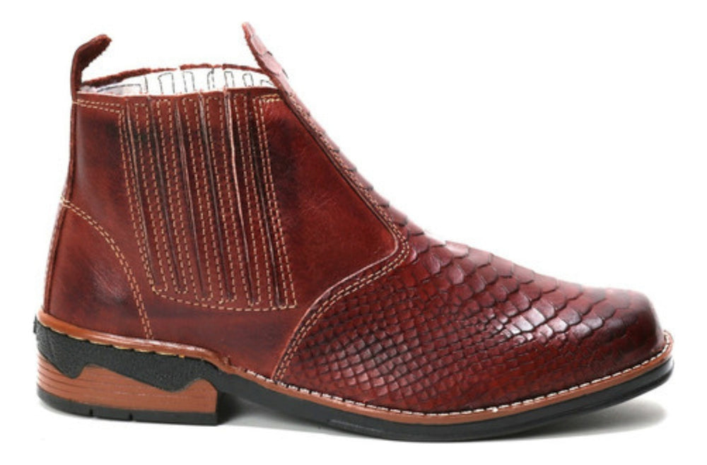Esta botina masculina em couro legítimo apresenta design country com bico quadrado, ideal para quem busca conforto e durabilidade em um calçado resistente para o dia a dia. Seu solado de borracha antiderrapante e palmilhas de E.V.A proporcionam apoio e segurança em variadas atividades.