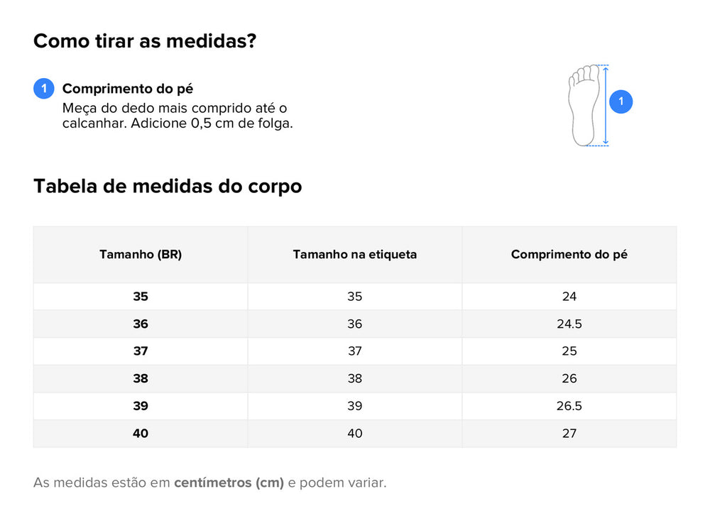 | Número | Comprimento da Palmilha (cm) |